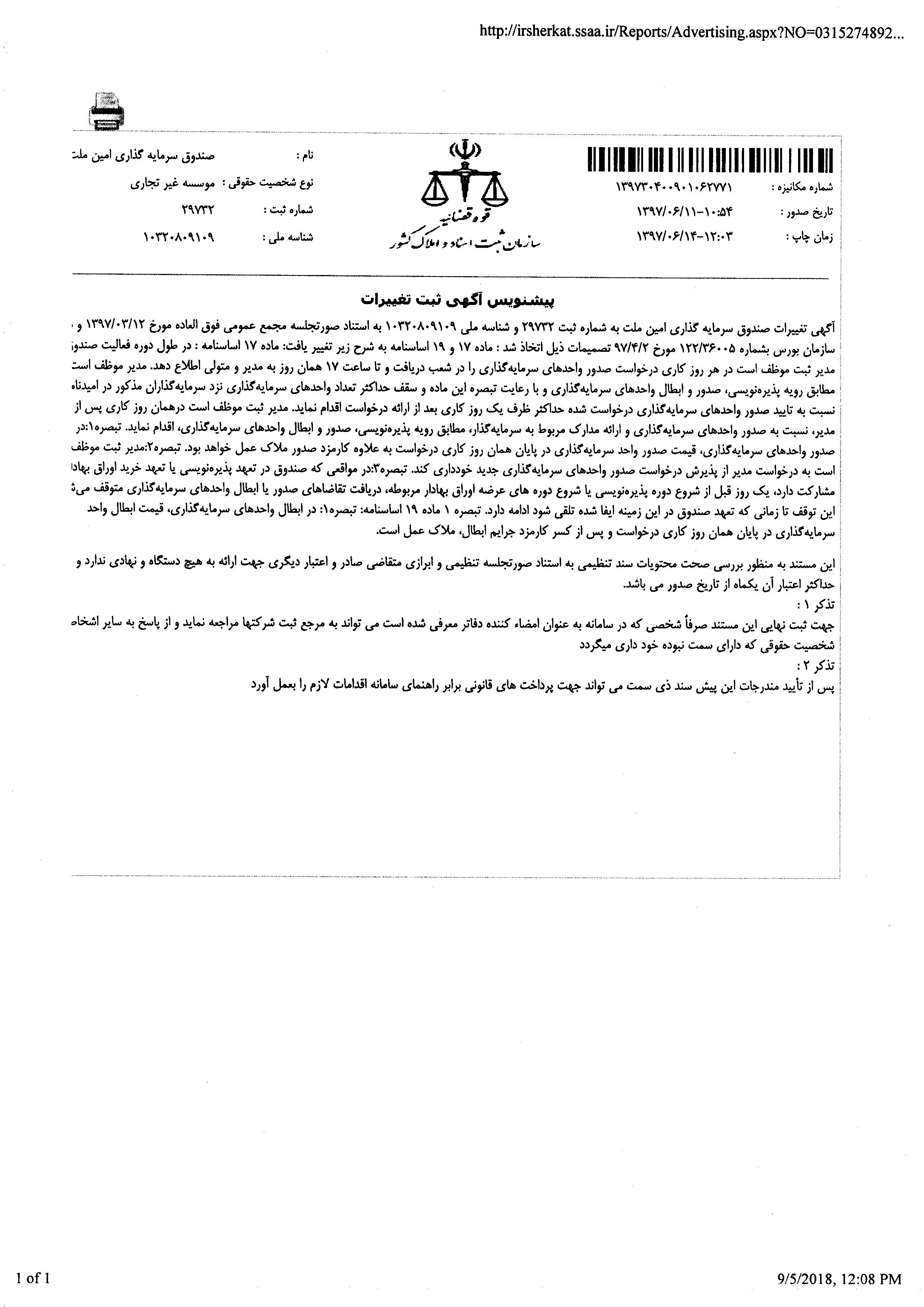 تایید مصوبات مجمع سالانه مورخ 14 مهر1397 صندوق امین ملت